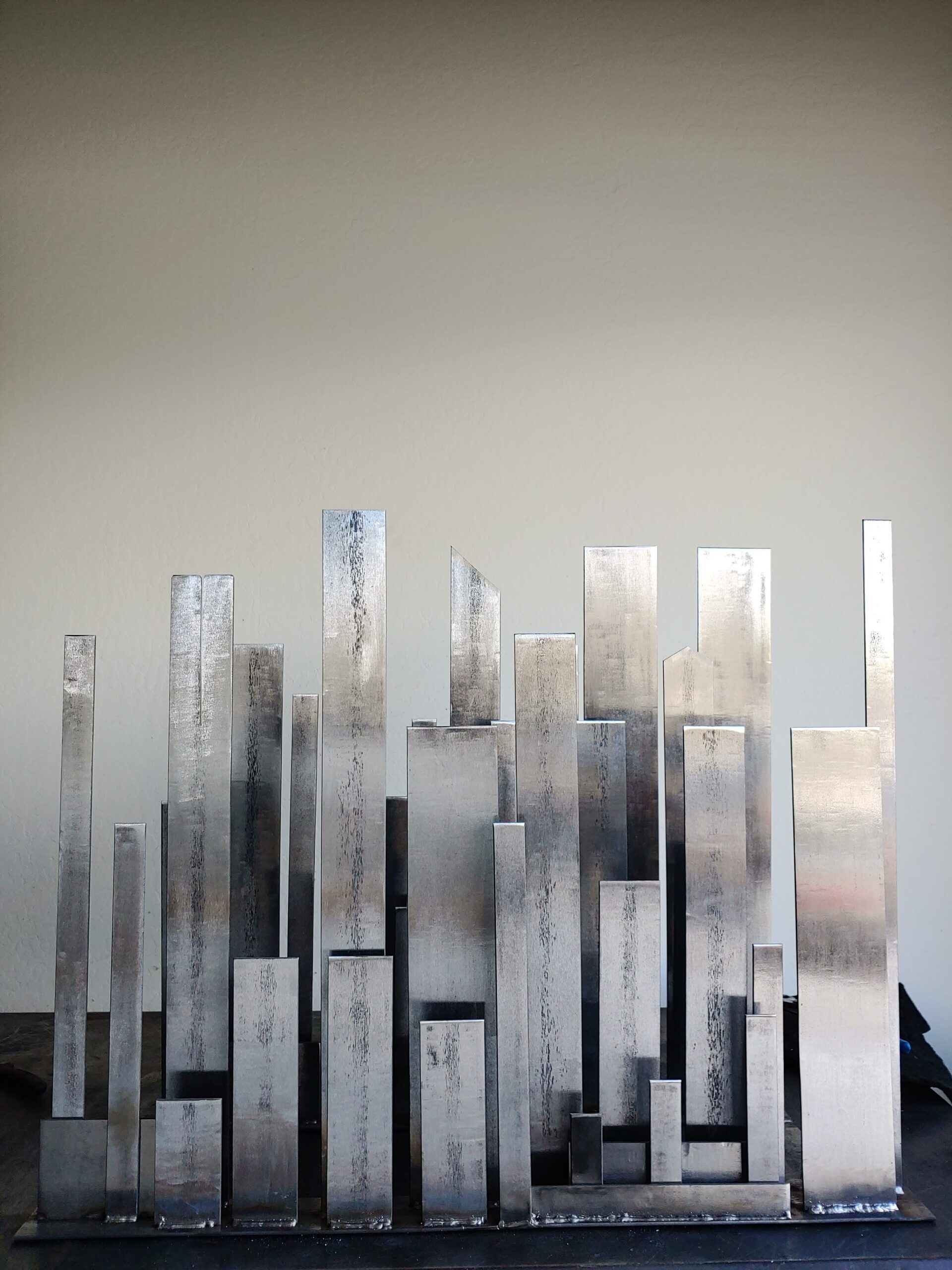 Vertical stainless steel flat bar bent to waves and polished reflective to a mirror finish to help with a fireplace that had very low gas pressure with minimal flame output. The reflecting helped in giving the illusion of having more flames.