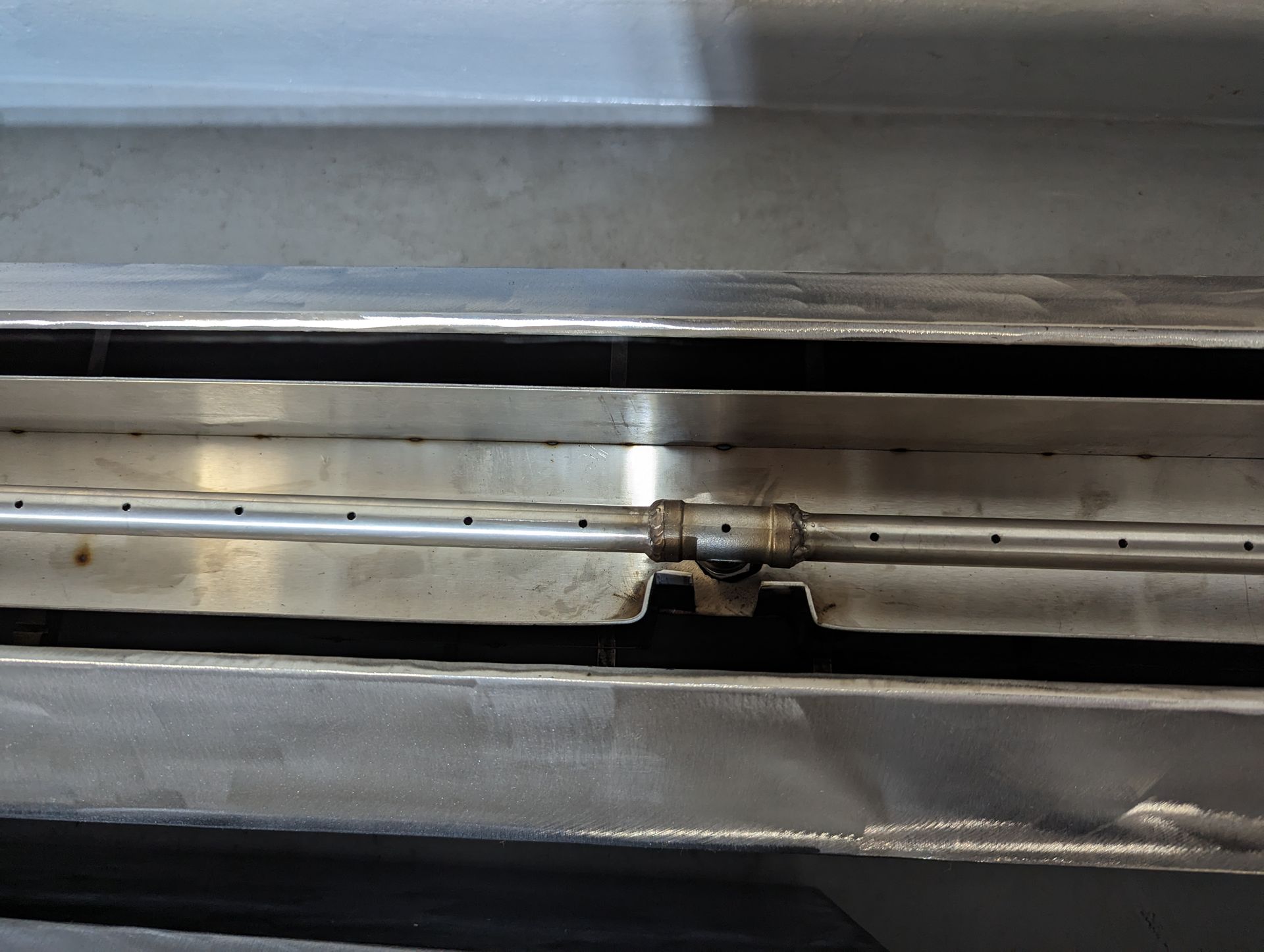 I custom made this burner with a custom made gas hub and called it the Octofire. Each burner jet has weep drainage and air mix. This prevents water from getting into the burner and giving some tall flames. On top of that, the end of each burner bar also has a weep hole with SS backer plate.