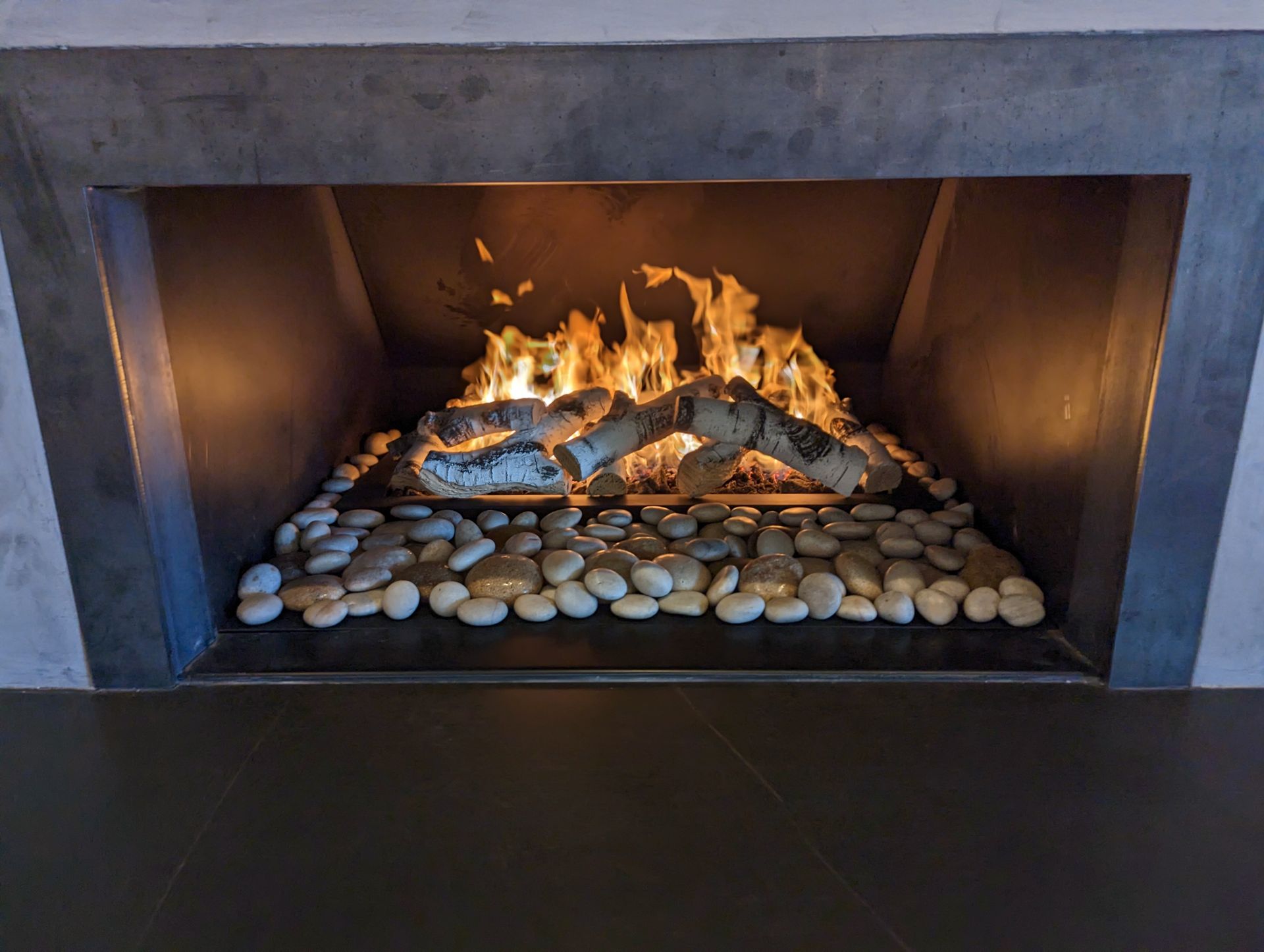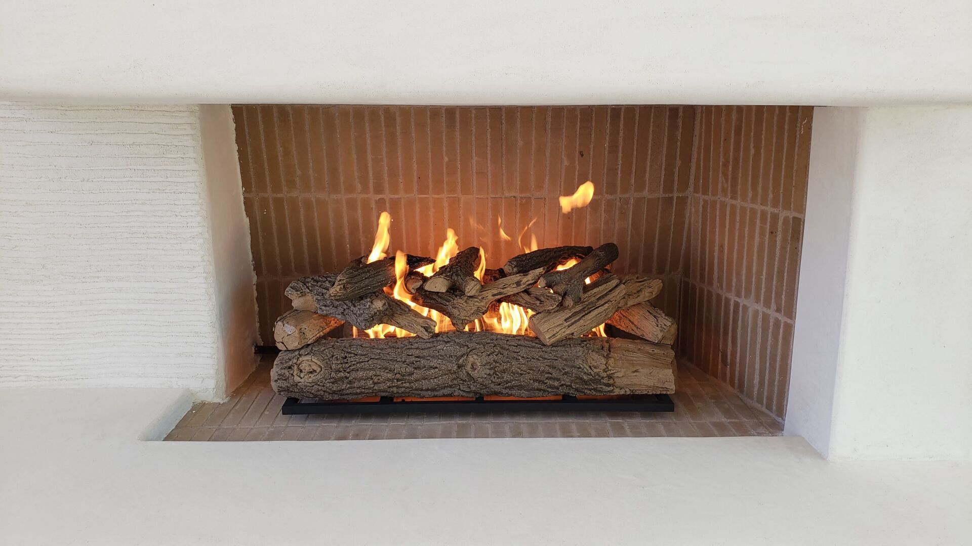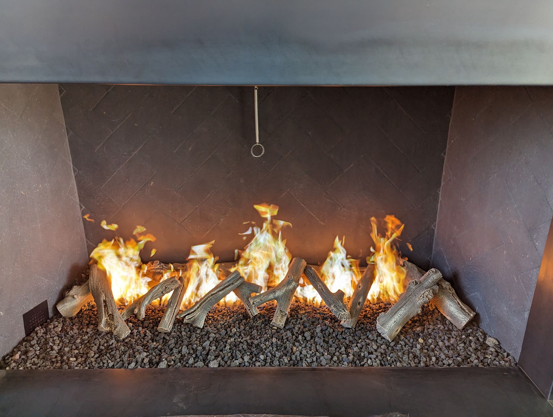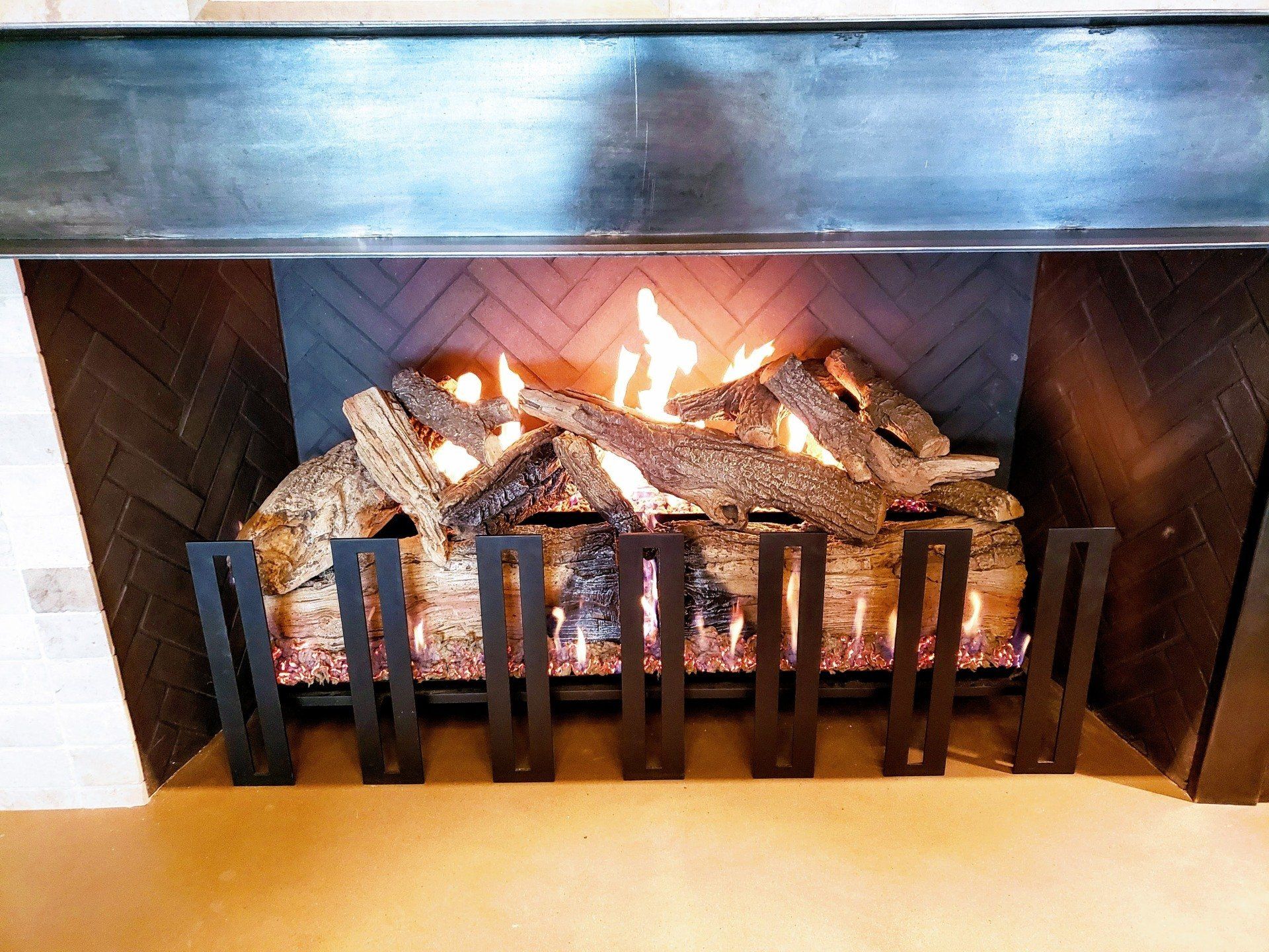 ButtonCustom modern grate with a custom made burner to accomodate these huge Eiklor Flames 48" Mombo gas logs. Pictured in the Pinnacle Peak Country Club dining.