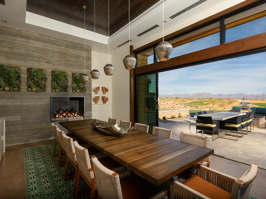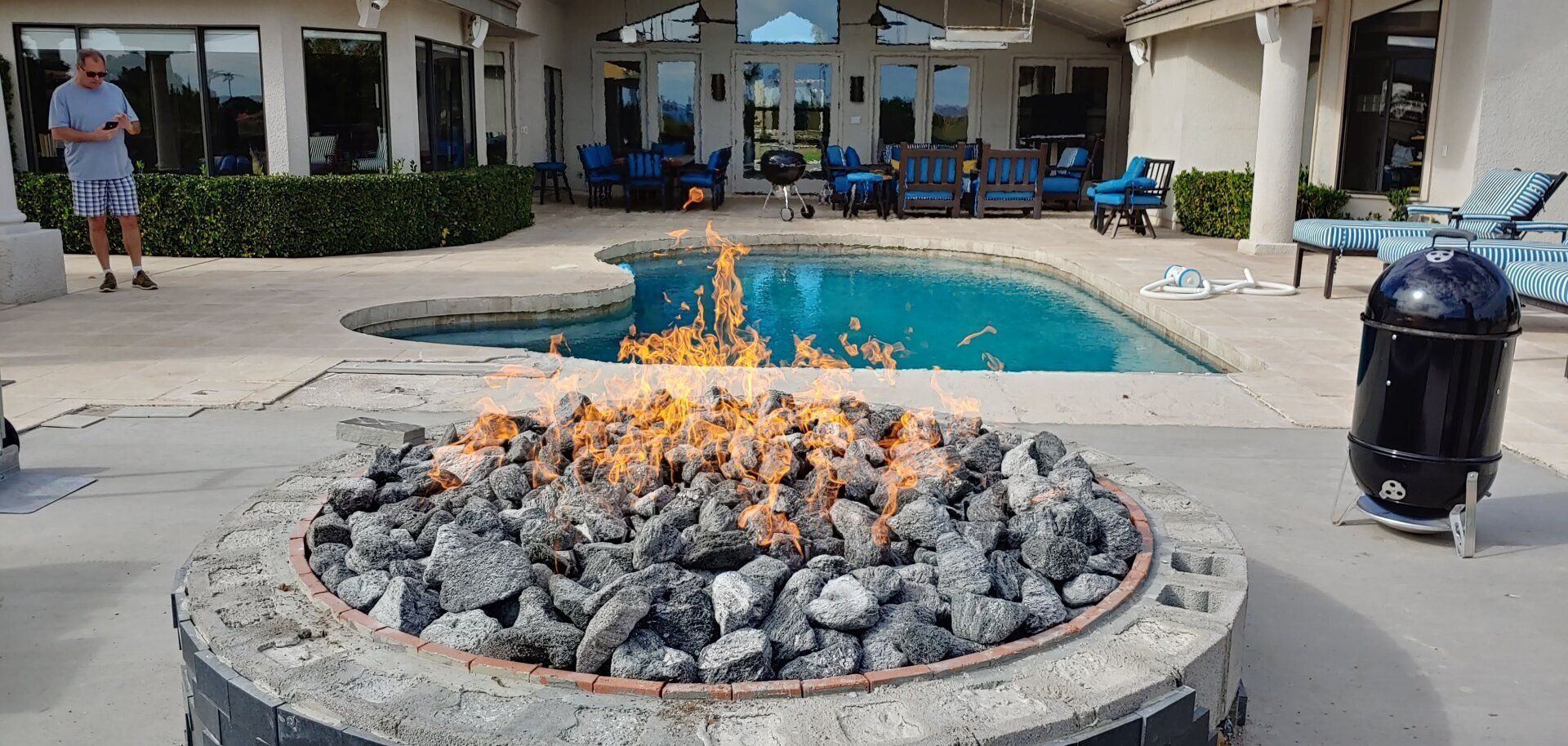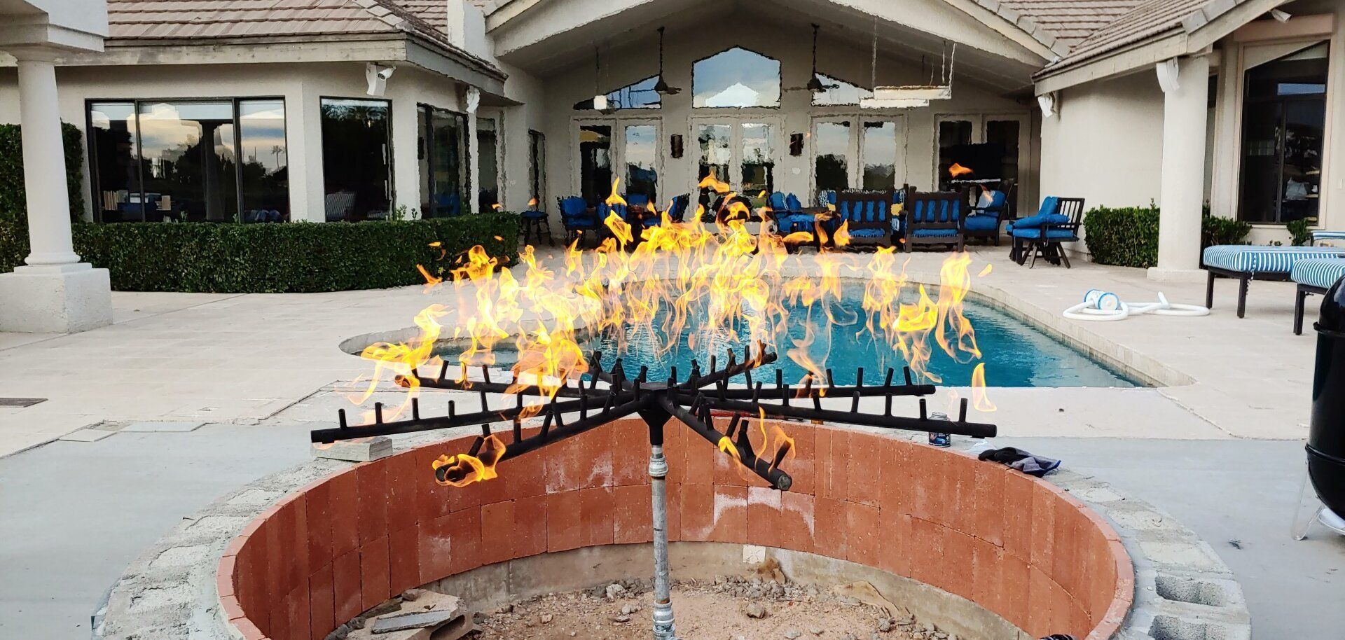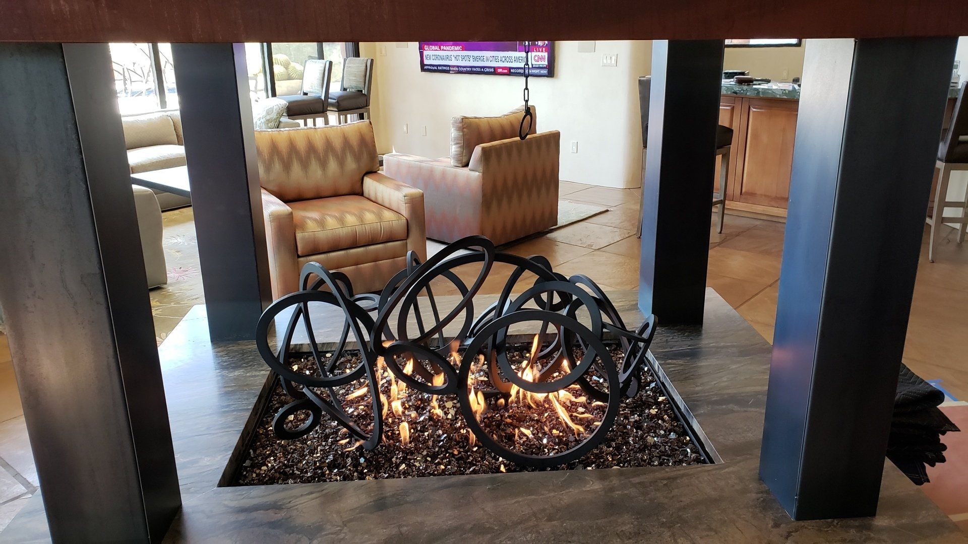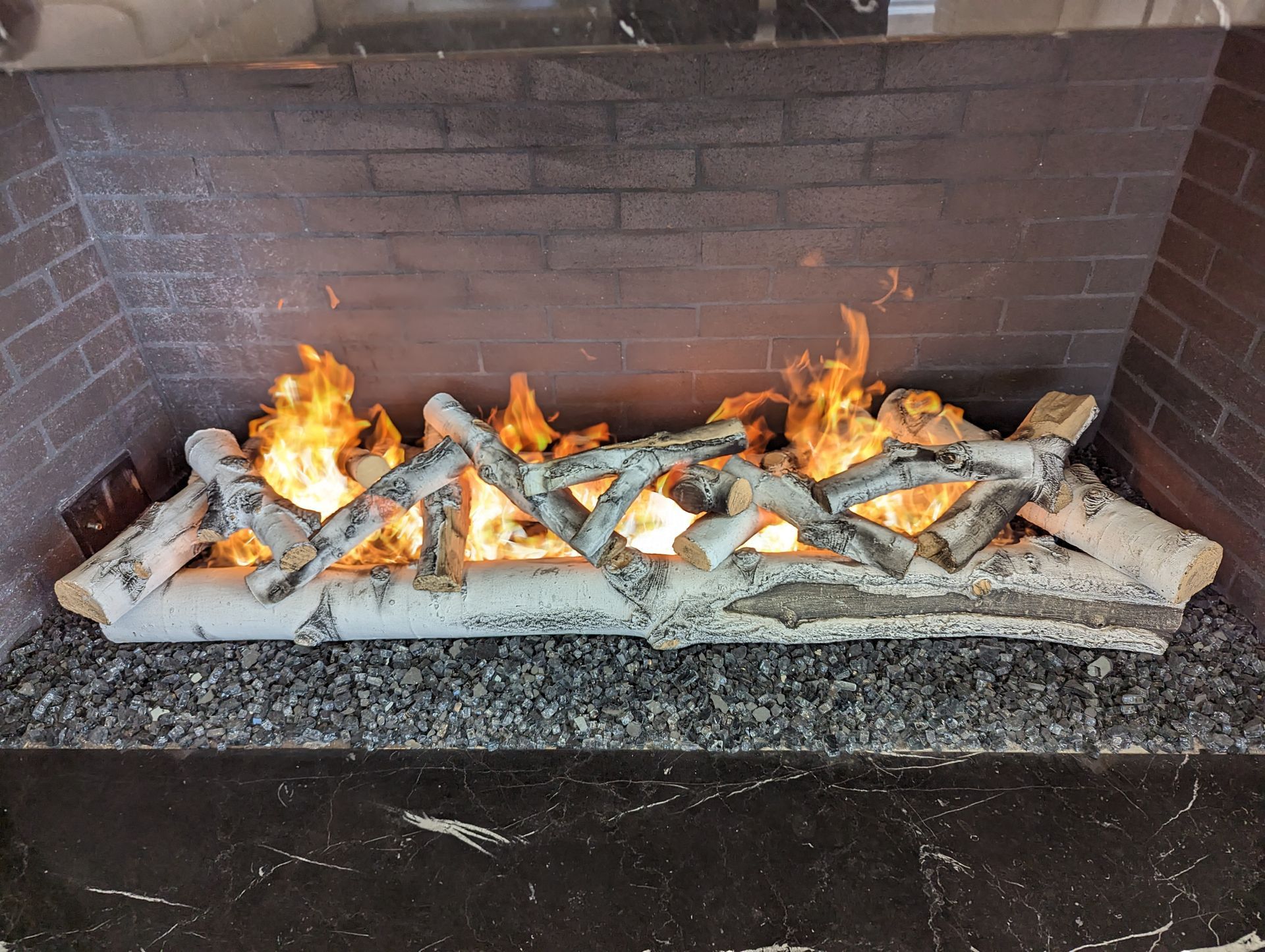 ButtonCustom modern grate with a custom made burner to accomodate these huge Eiklor Flames 48" Mombo gas logs. Pictured in the Pinnacle Peak Country Club dining.