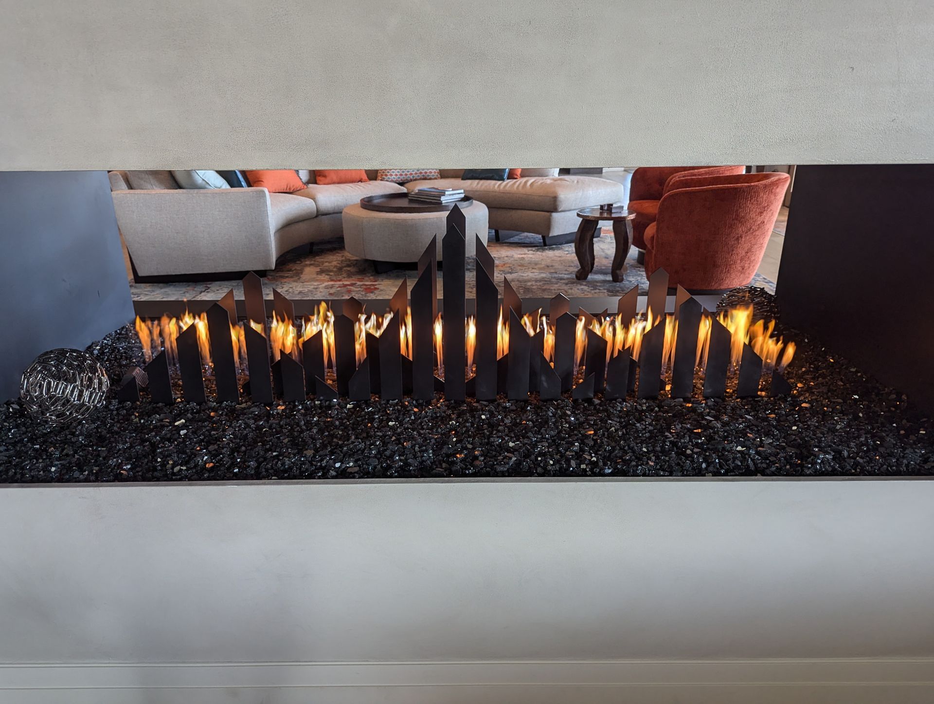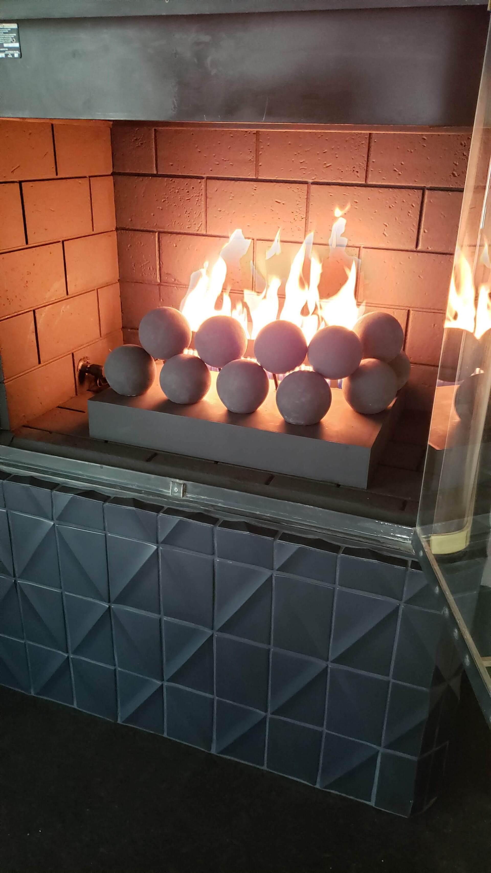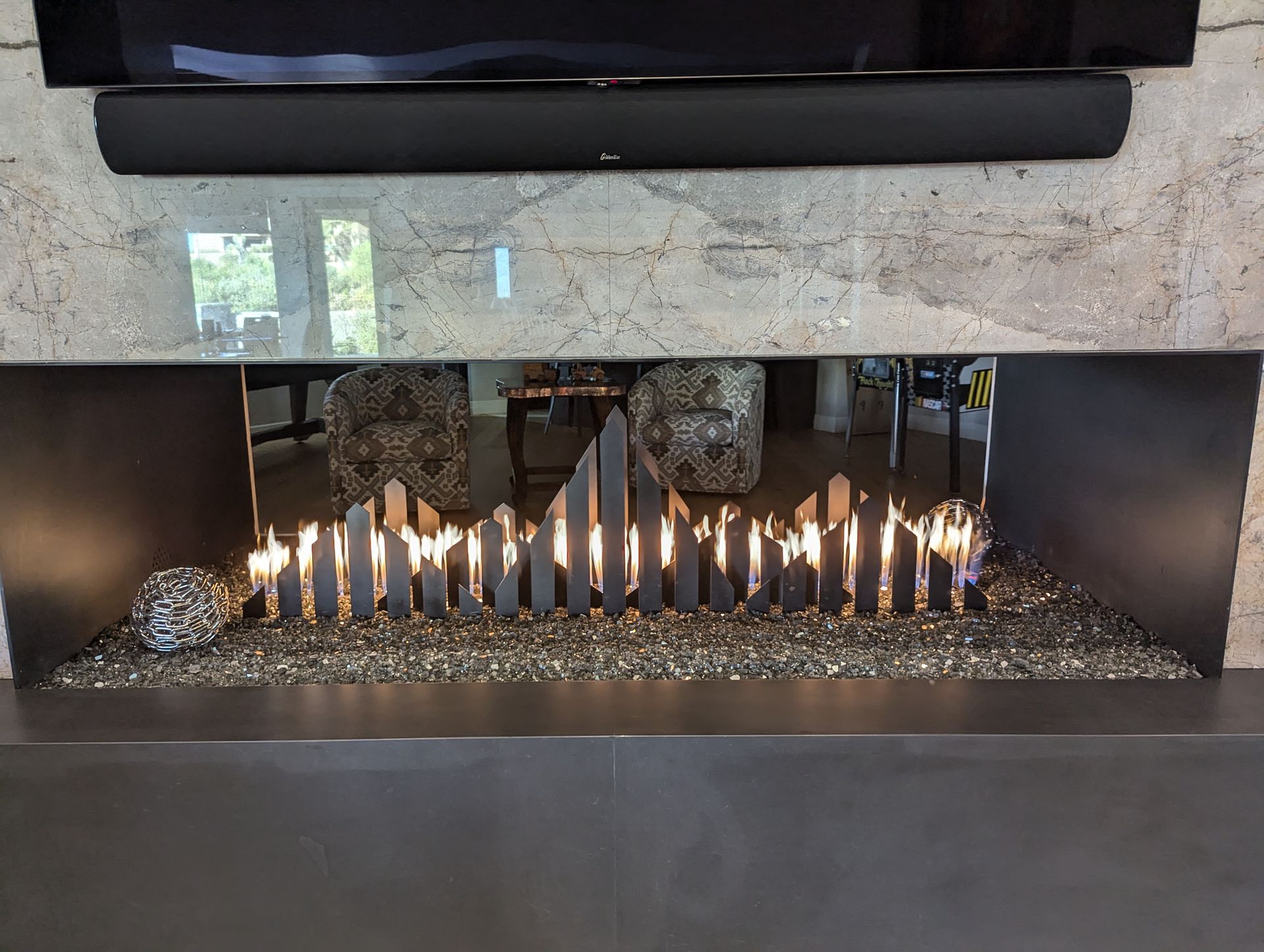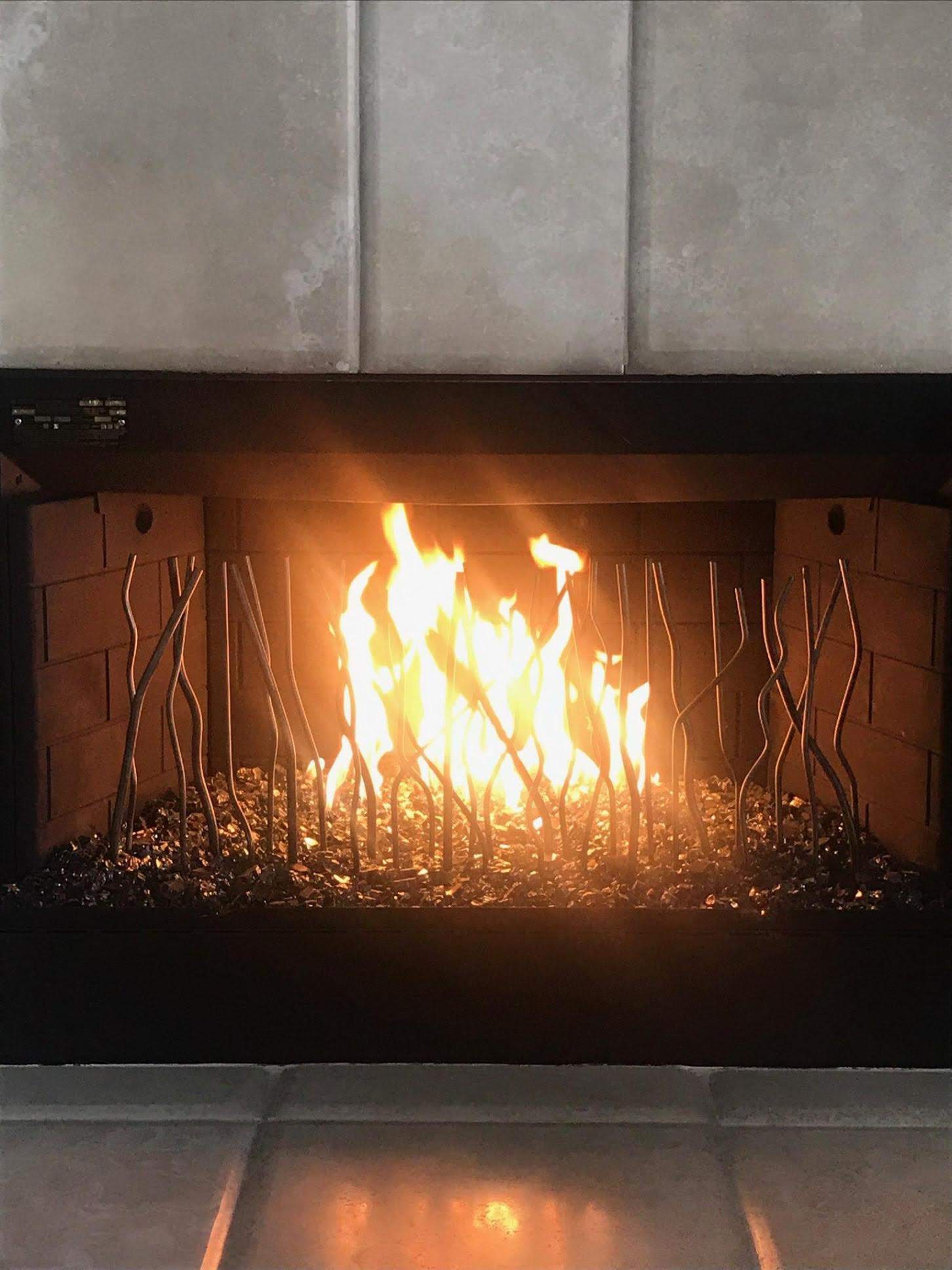 ButtonCustom designed to replace fireplace art that caused too much sooting in this Infinite Fireplace. Burner had low flames and delayed combustion. See-through fireplace was not drafting and combusted gas was spilling into the room causing a nauseating smell. This fire art was designed in such a way to correct the draft draw and increase flame height without changing anything to the burner or IPI system. This also helped in a quicker startup combustion within 3 seconds.