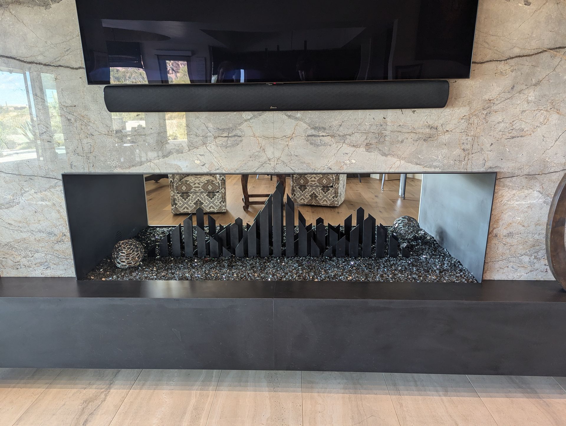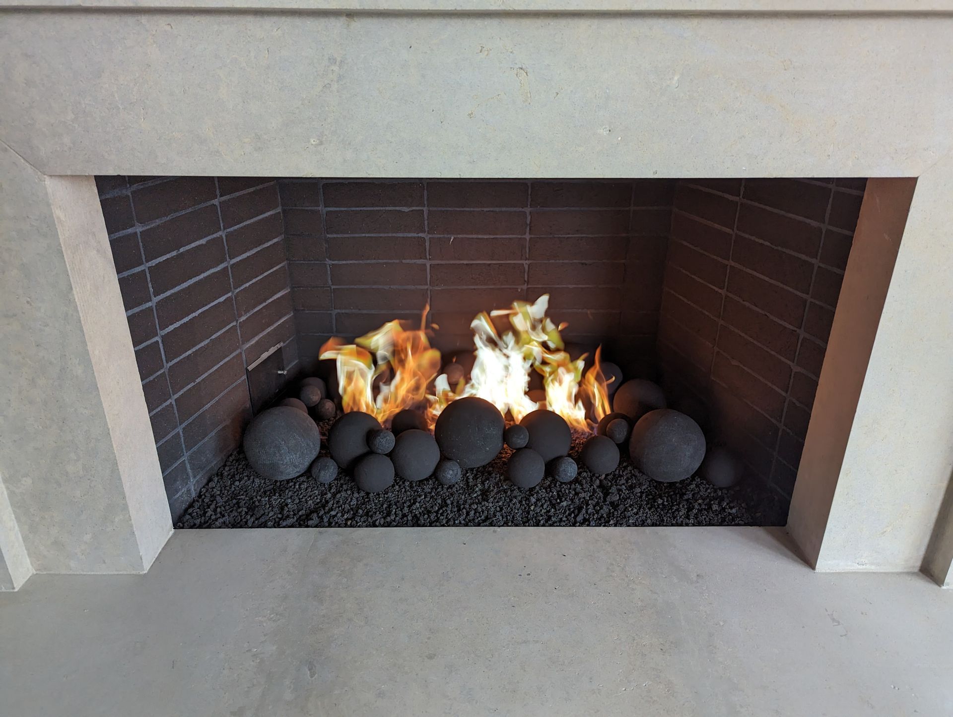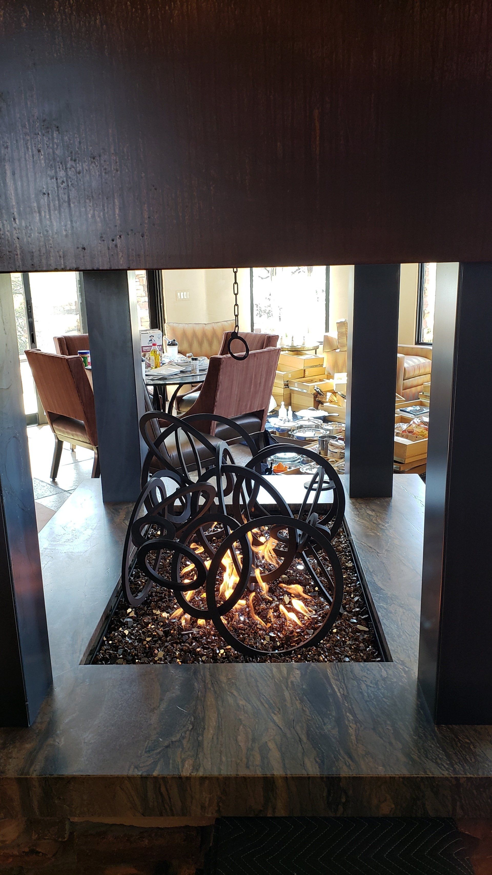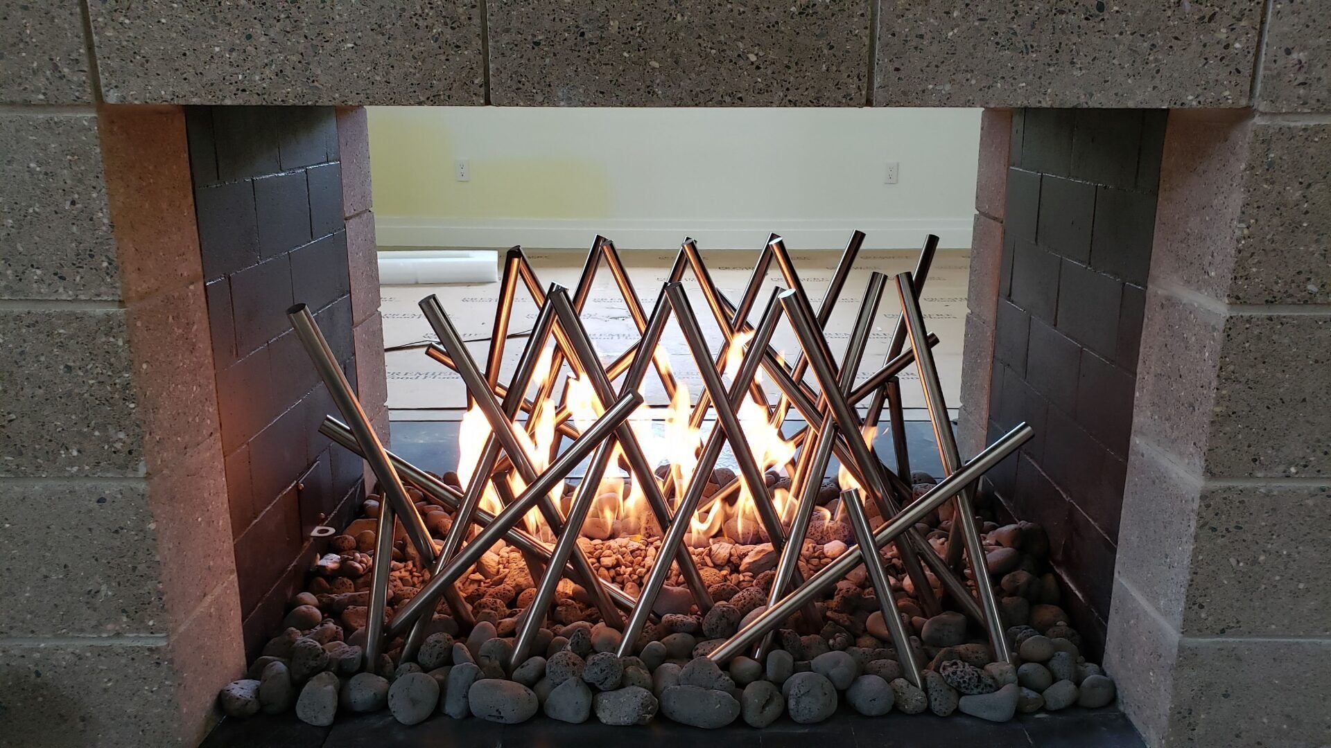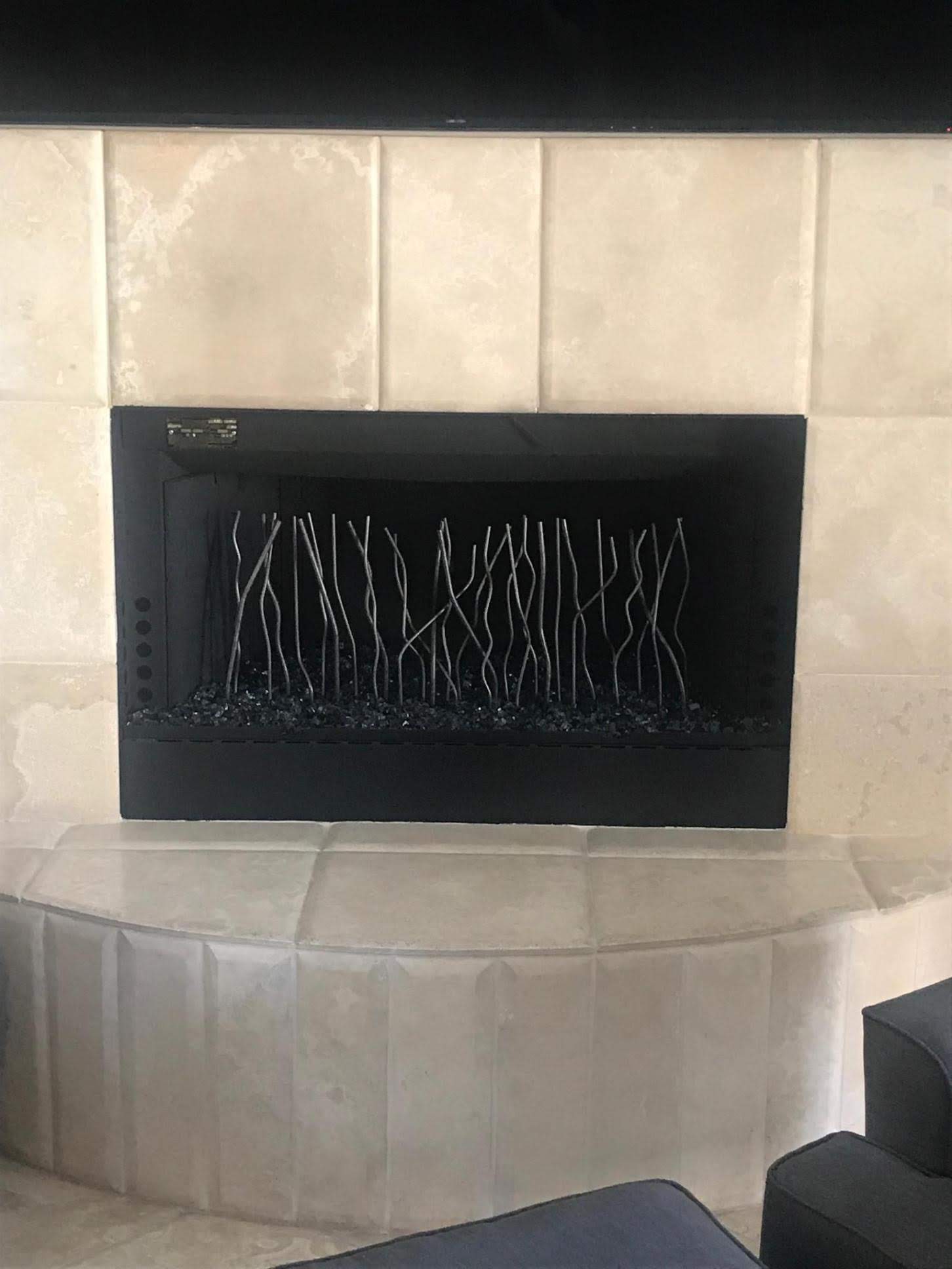 ButtonCustom designed to replace fireplace art that caused too much sooting in this Infinite Fireplace. Burner had low flames and delayed combustion. See-through fireplace was not drafting and combusted gas was spilling into the room causing a nauseating smell. This fire art was designed in such a way to correct the draft draw and increase flame height without changing anything to the burner or IPI system. This also helped in a quicker startup combustion within 3 seconds.