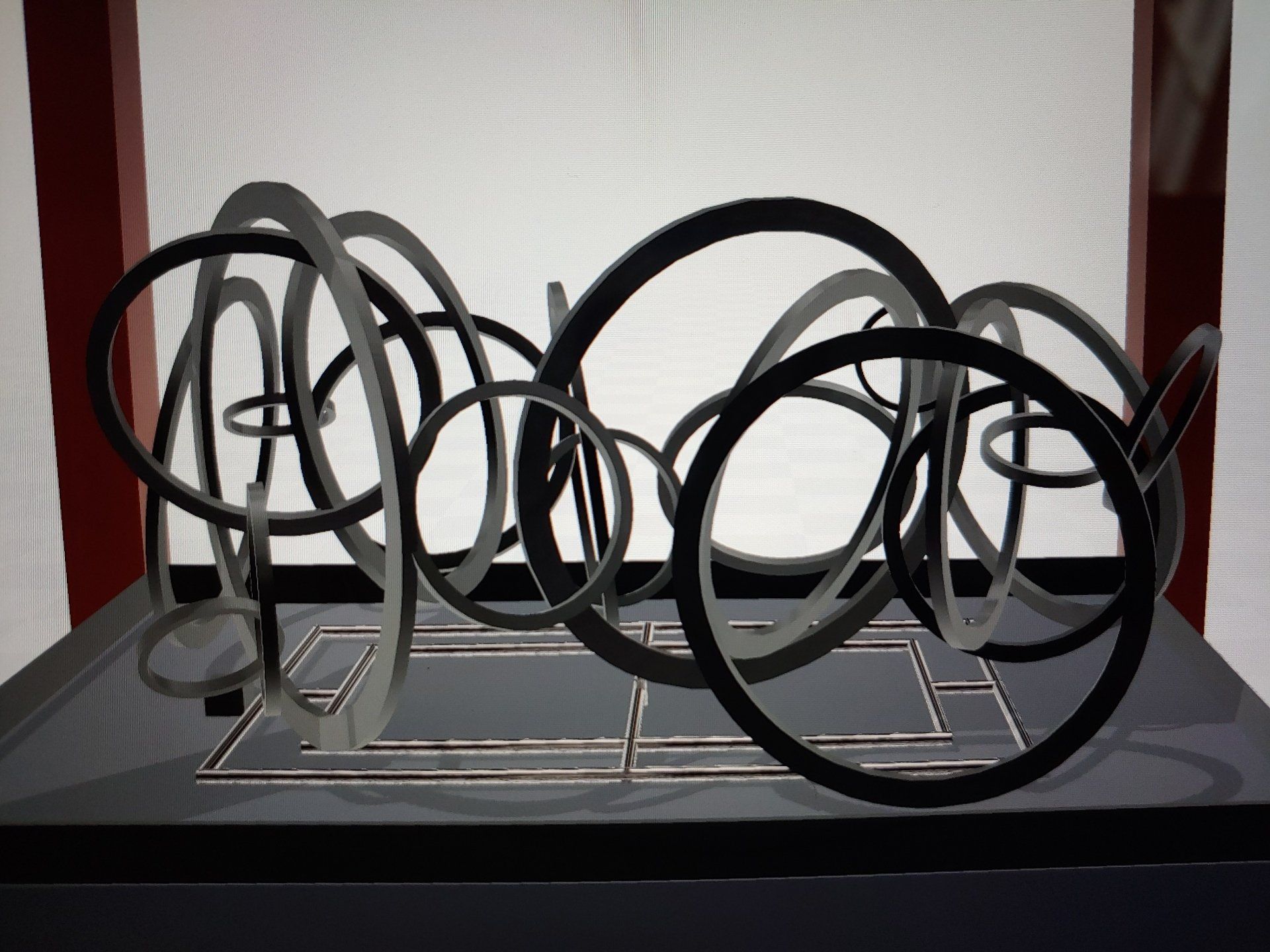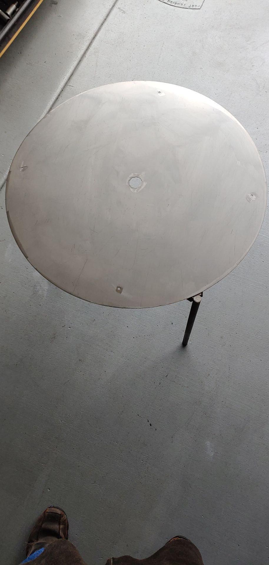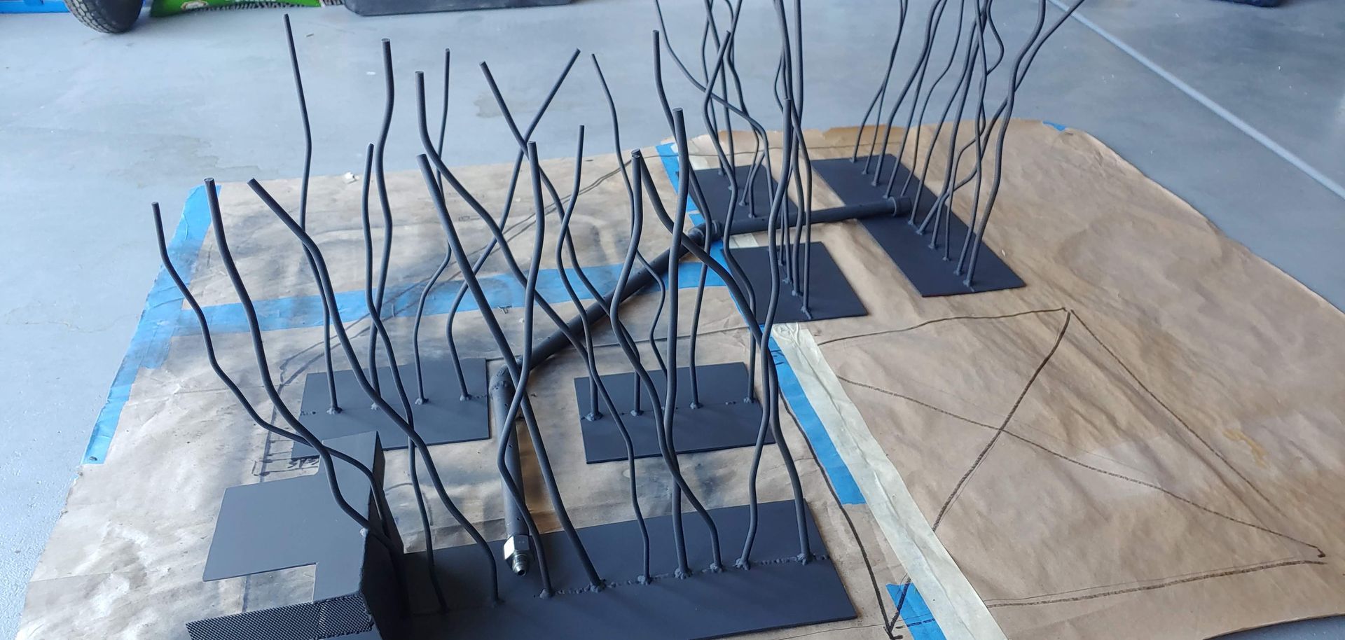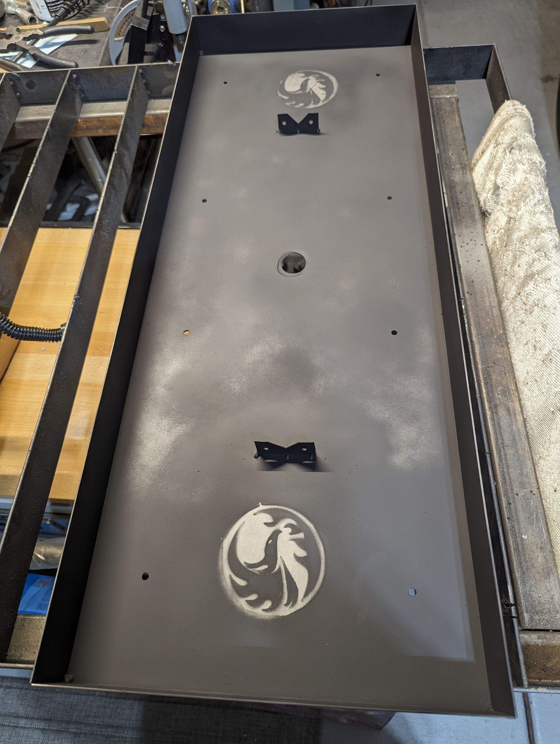 ButtonAbstract placement of steel rings situated to not imping flames of custom made burner and baffles underneath, housing an electronic ignition IPI system. Pictured during build phase.
