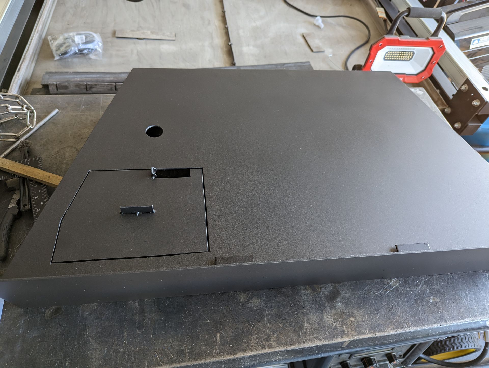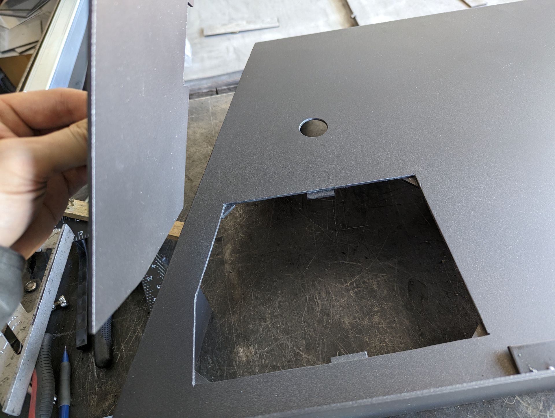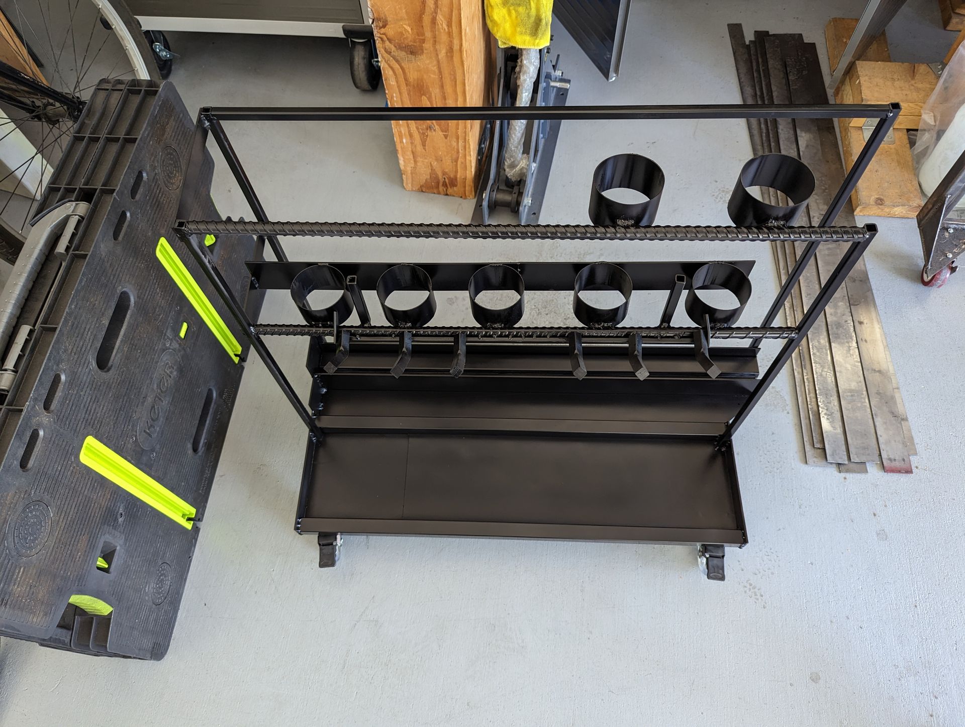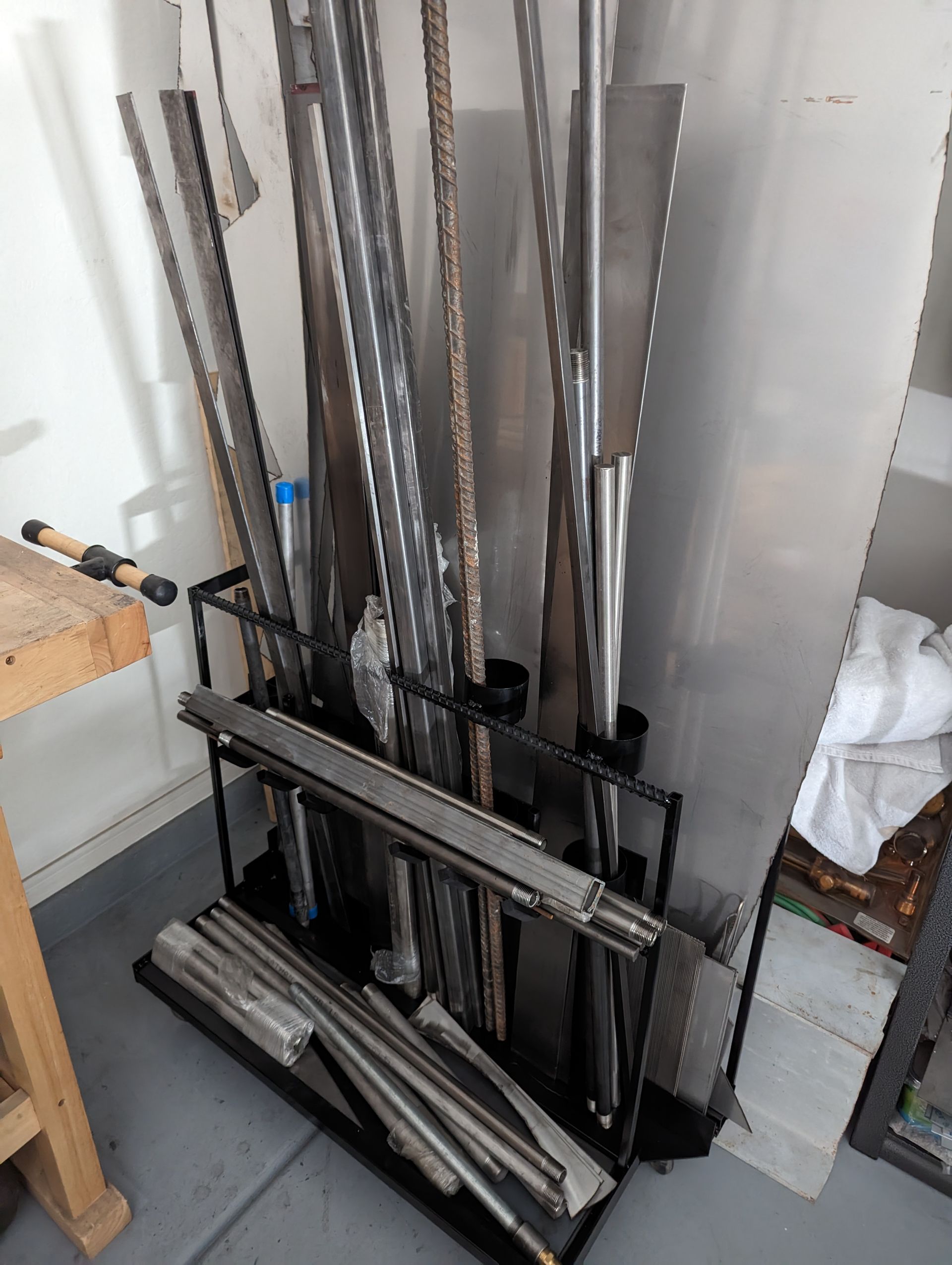 ButtonAbstract placement of steel rings situated to not imping flames of custom made burner and baffles underneath, housing an electronic ignition IPI system. Pictured during build phase.
