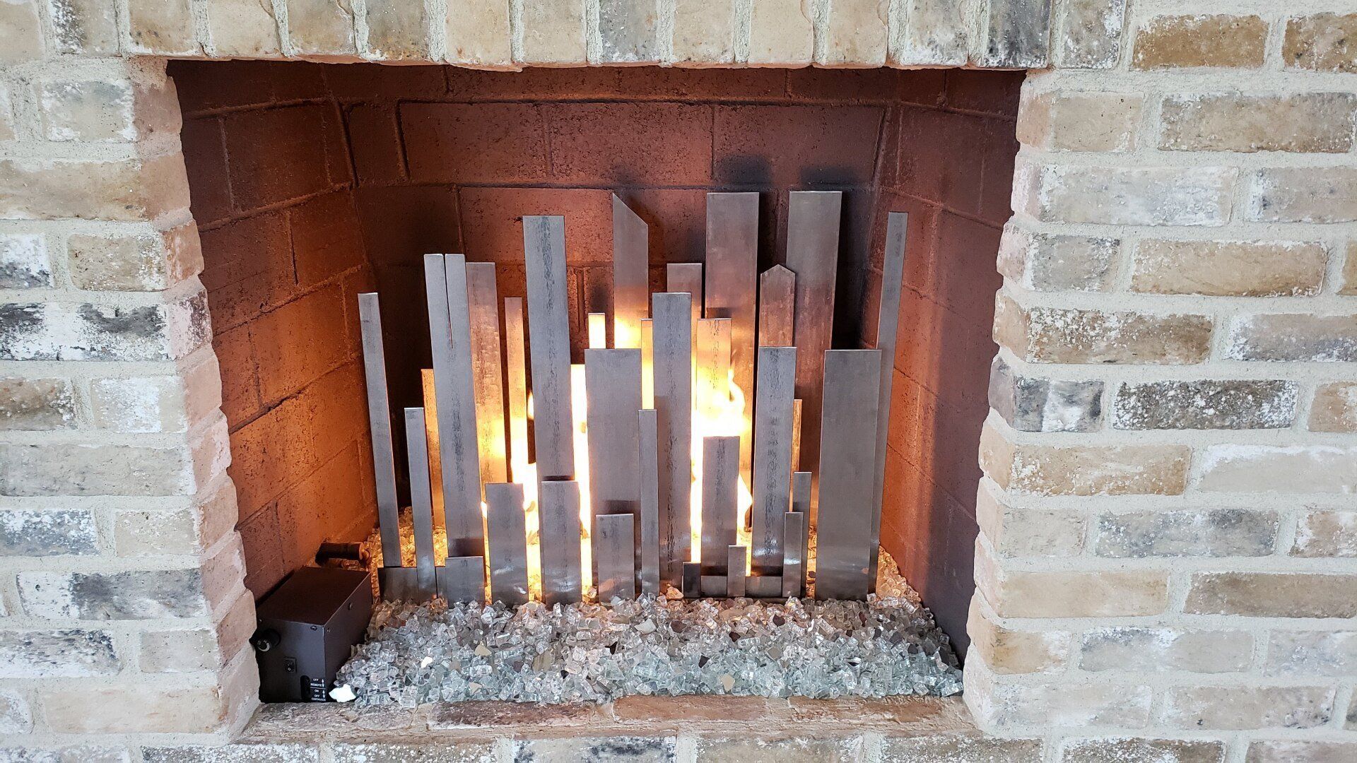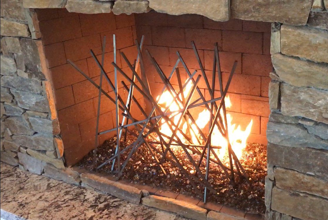 ButtonVertical stainless steel flat bar bent to waves and polished reflective to a mirror finish to help with a fireplace that had very low gas pressure with minimal flame output. The reflecting helped in giving the illusion of having more flames.