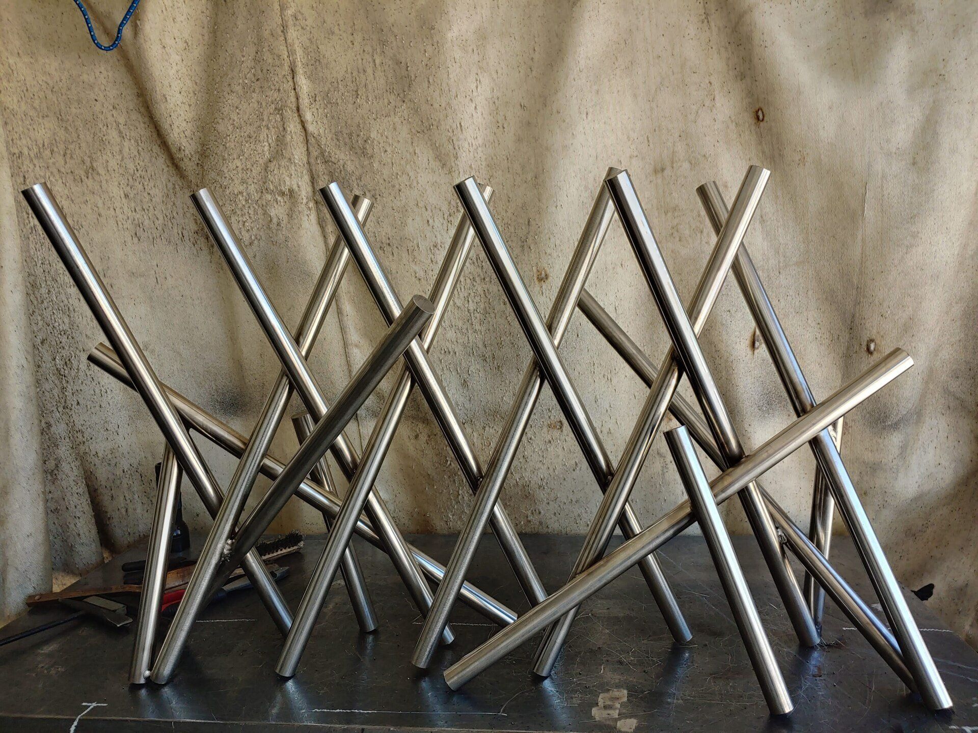 ButtonVertical stainless steel flat bar bent to waves and polished reflective to a mirror finish. This is to help bounce light from the flames off each vertical bar giving it a unique look for a conversational centerpiece.