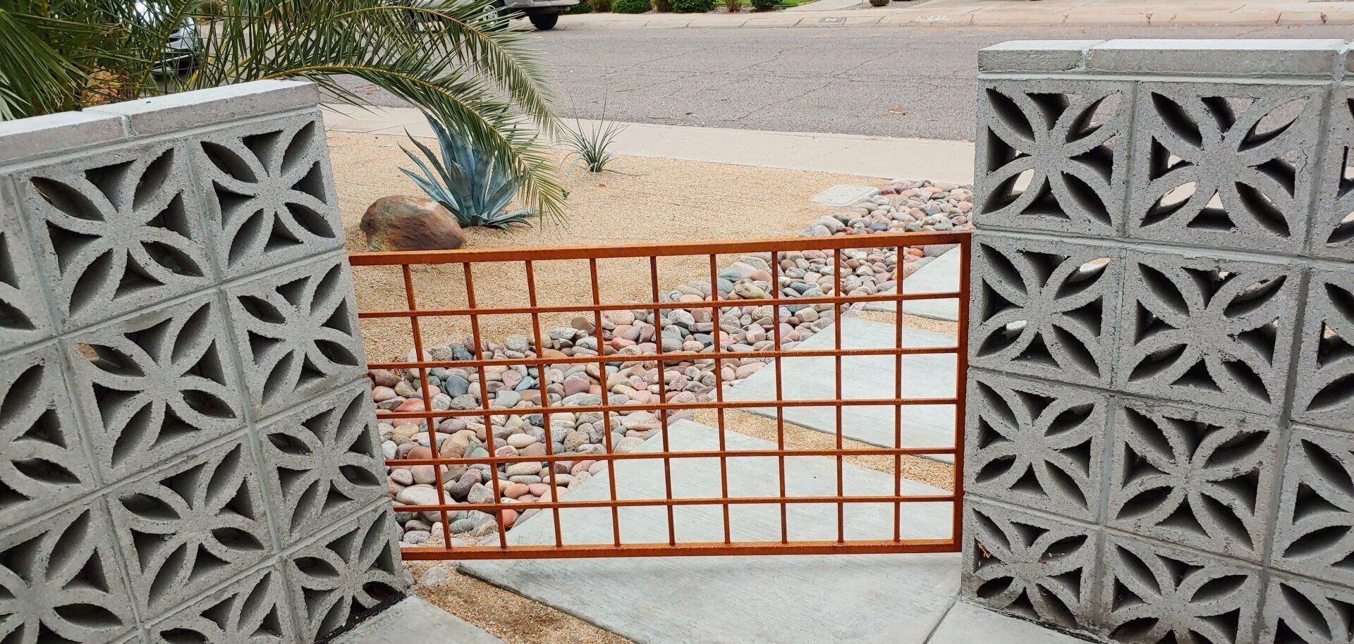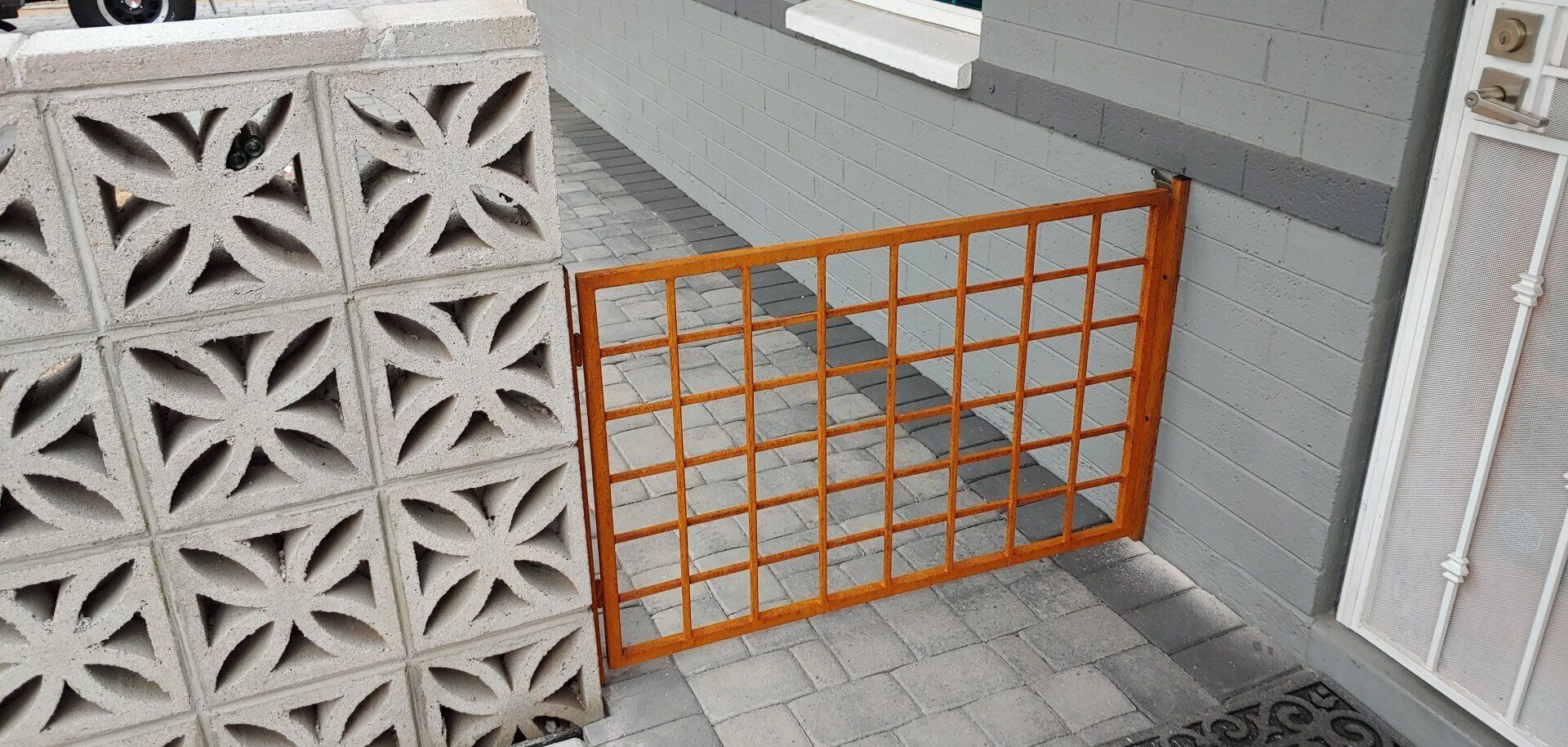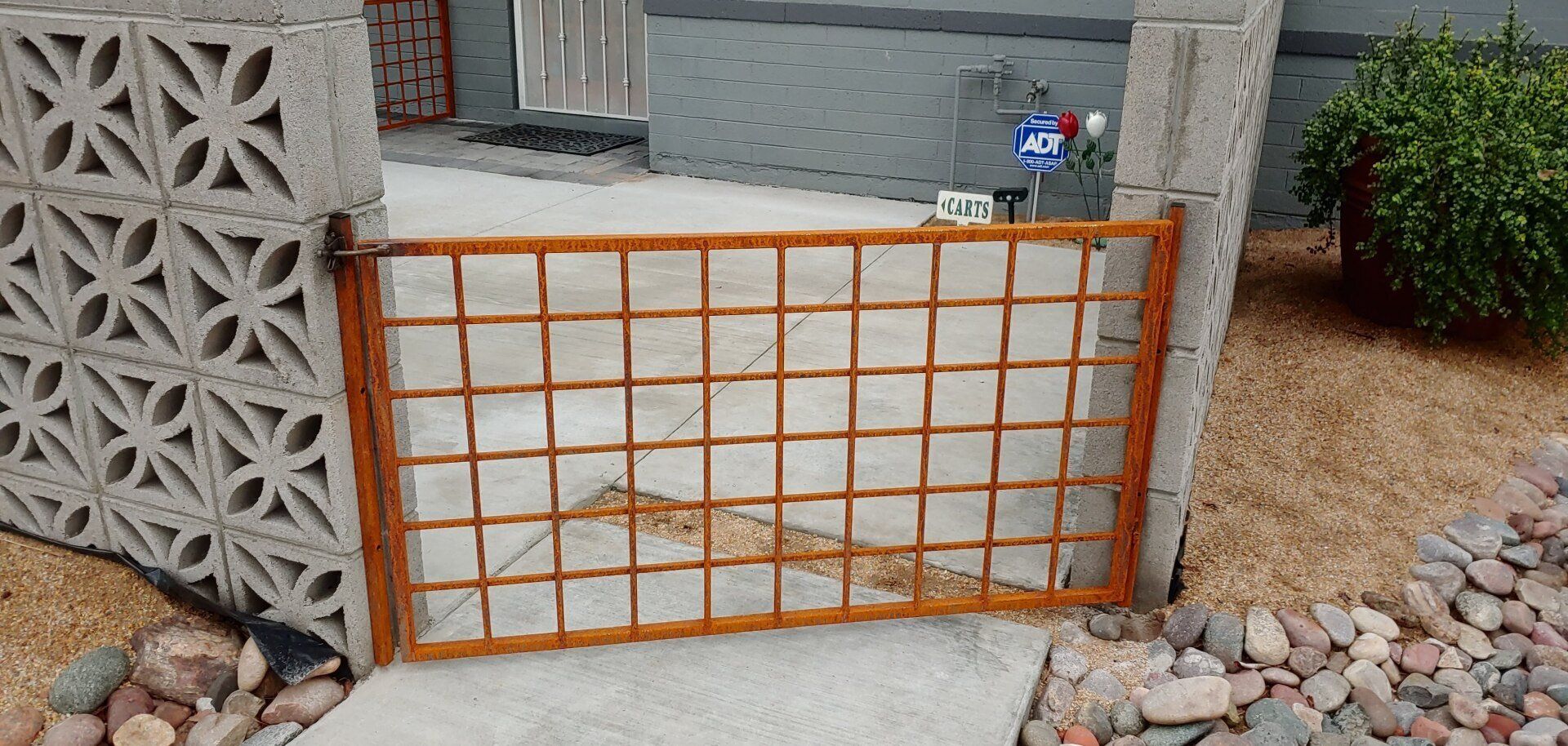 ButtonCustom made gate specifically rusted and made to home owners request. Complete with bullet hinges and mounted.